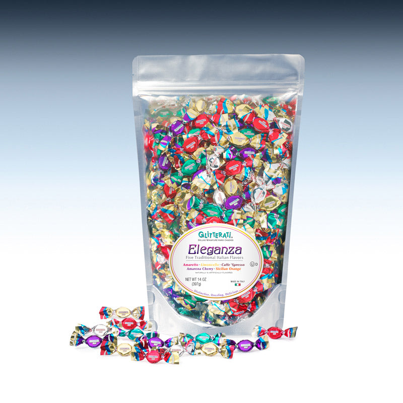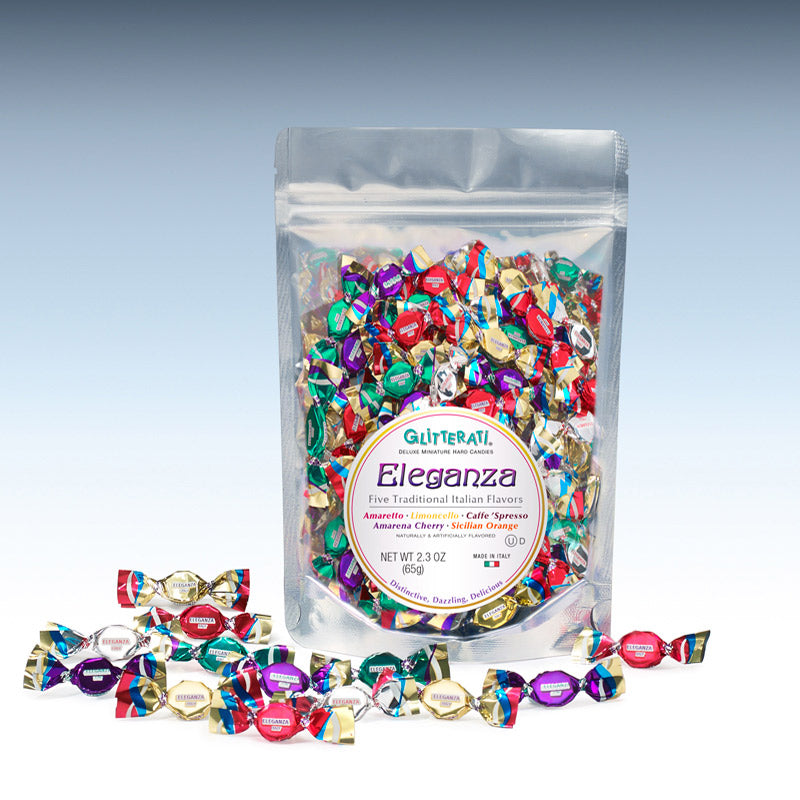 Introducing ELEGANZA, the latest addition to our celebrated GLITTERATI Collection. This stunningly wrapped assortment is drawing rave reviews, notably for its fabulous, uniquely Italian flavors. All are second to none for sublime taste and quality. For those seeking only the finest, look no further. Amaretto, Limoncello, Amarena Cherry, Caffe ‘Spresso, and Sicilian Orange