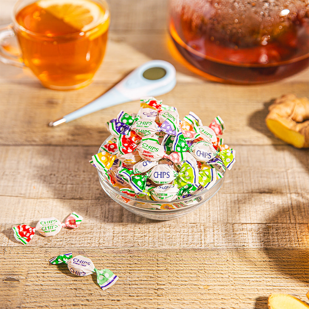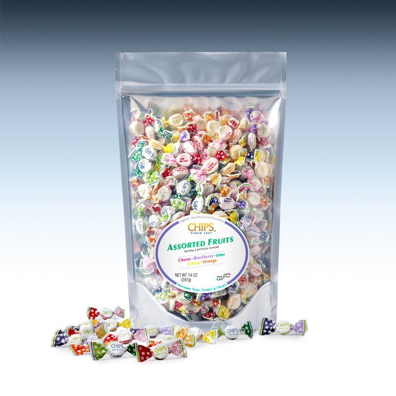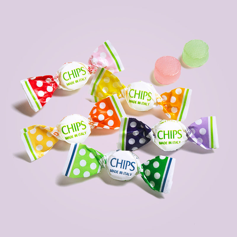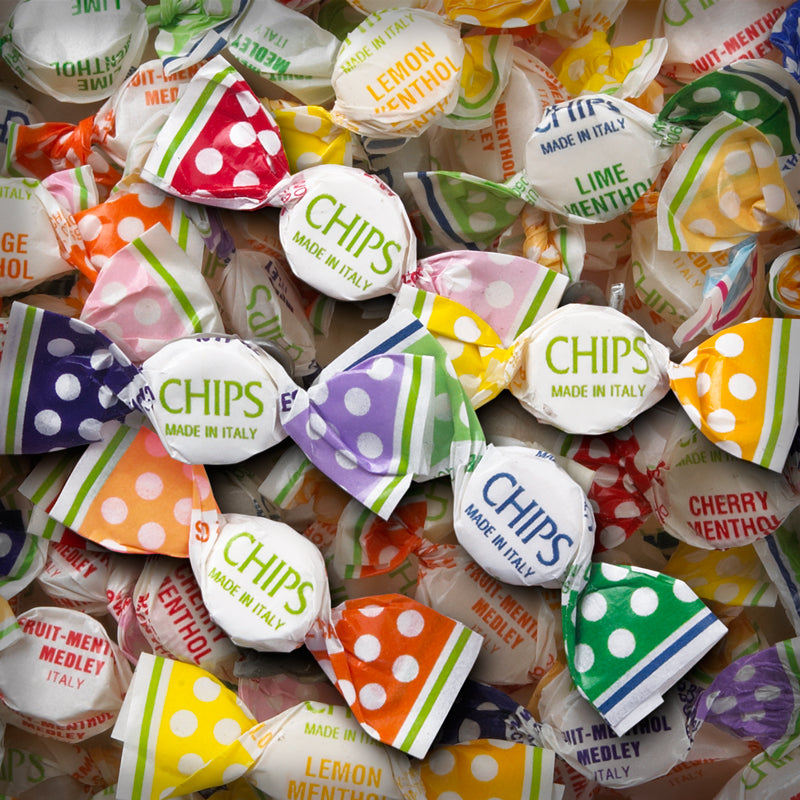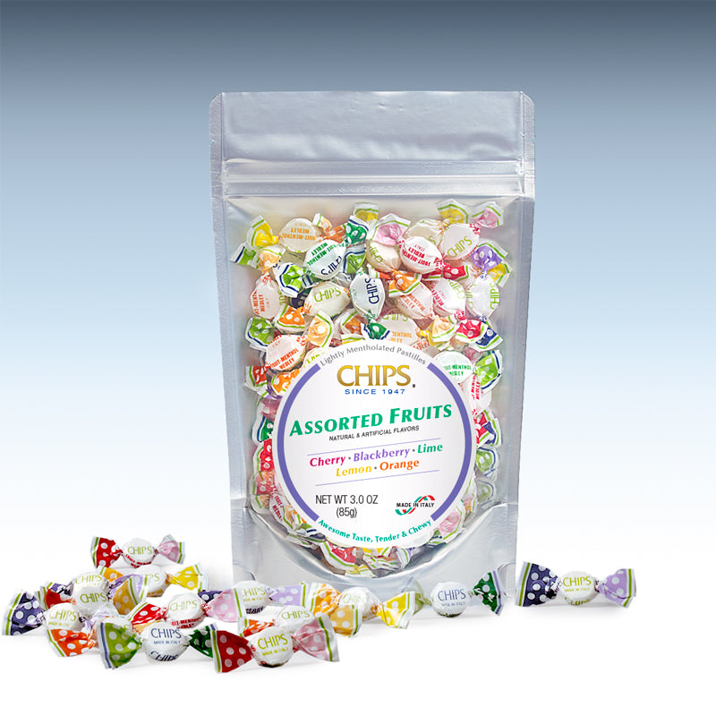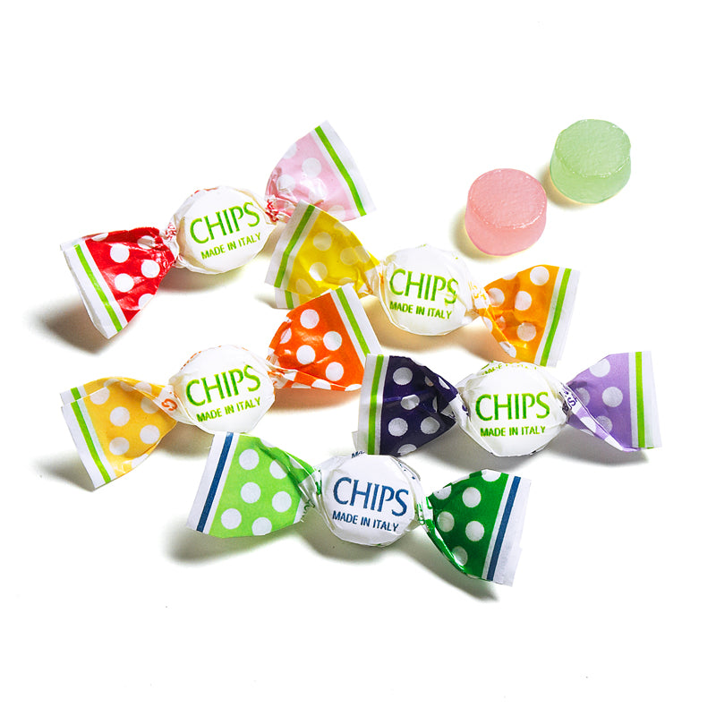 For nearly 75 years, CHIPS have been the go-to favorite of many professional speakers and singers. Inside each eye-catching wrapper, there’s an amazing little pastille whose lightly mentholated formula was perfected in Italy to gently soothe the throat, freshen the breath and please the palate. Luscious fruit flavors with an added touch of menthol combine to create these deliciously refreshing miniature pastilles. Made with Natural Acacia Gum for delightful chewiness, CHIPS Menthol Fruits are great for dry, scratchy throats or just a little zing!